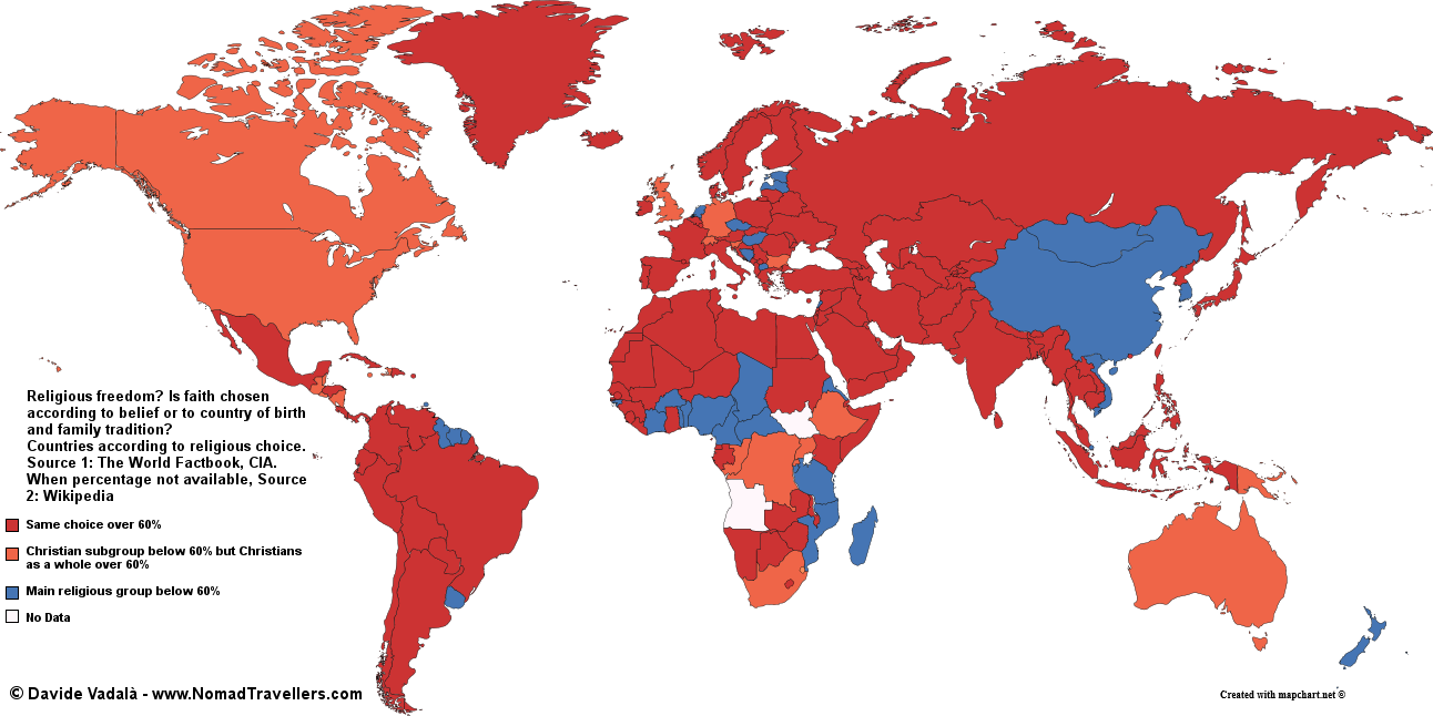 For some time I had this idea in mind, and now that I spared a couple of hours I put it into practice. I wanted to create a map about religious diversity, showing how most of the people in the world choose their religion (actually they are assigned their religion at birth) according to their family and country, and not according to faith.